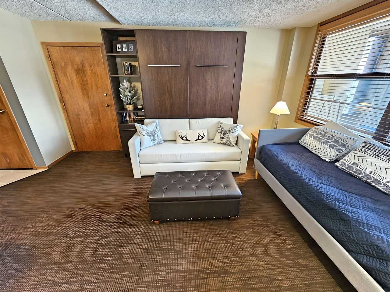 After a fun day on the slopes relax in the huge indoor hot tub or a session in the shared sauna. If you need to get some work done while away, there is a desk space available with Wi-Fi as well as flat screen TV with cable. Plus, the studio portion has kitchenette with mini fridge, microwave and coffee maker which is great for preparing basic meals and the ever-important morning coffee.